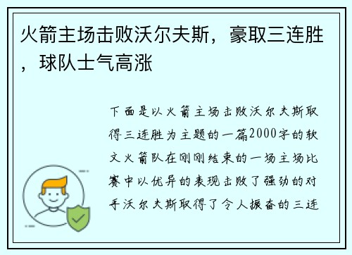 火箭主场击败沃尔夫斯,豪取三连胜,球队士气高涨